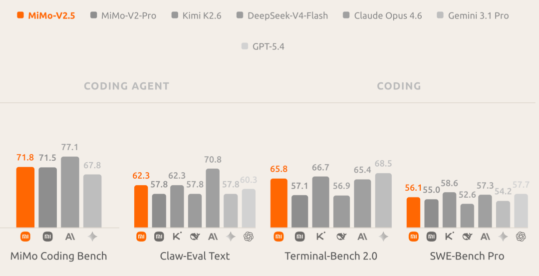 从小米最新公布的测评结果来看,MiMo-V2.5在Claw-Eval Text、Terminal-Bench 2.0、SWE-Bench Pro等多项测评中大幅超越了DeepSeek最新发布的DeepSeek-V4-Flash。