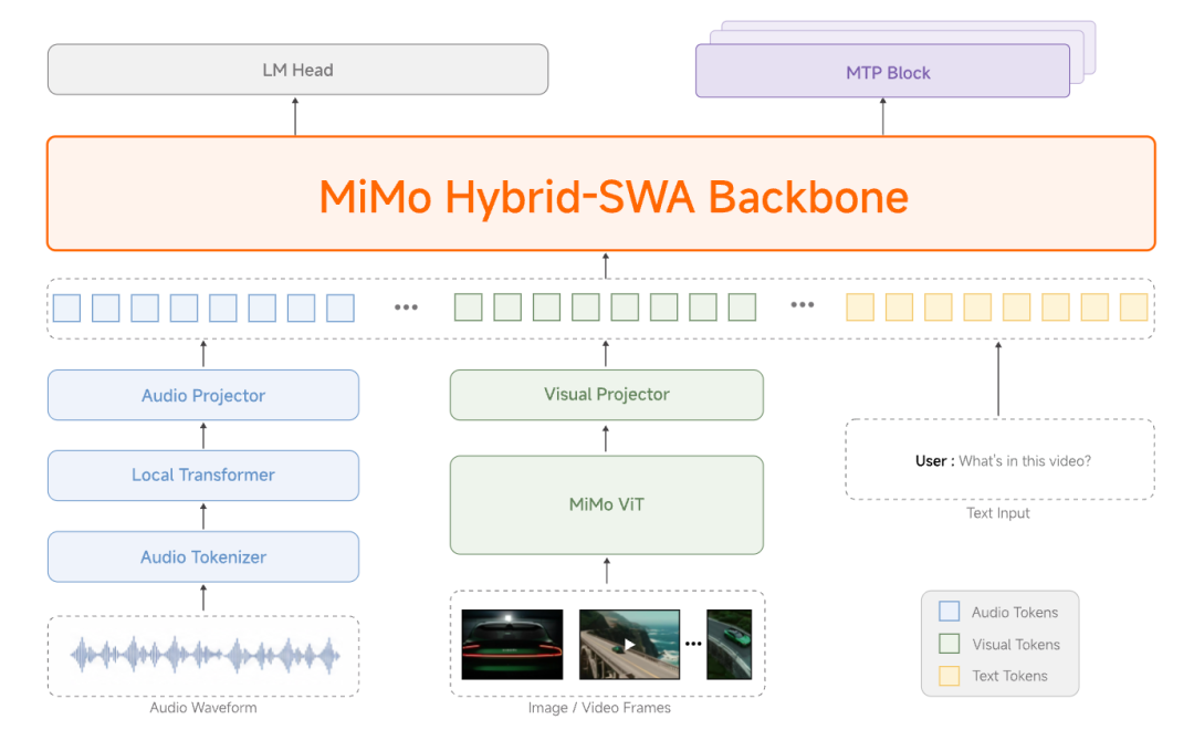 再来看看MiMo-V2.5,这是一个3100亿(310B)参数的稀疏MoE模型,拥有150亿(15B)激活参数,在48万亿(48T)个Token上进行训练。它的语言主干框架继承了MiMo-V2-Flash的混合滑动窗口注意力机制,并搭载自研预训练视觉、音频编码器,两类编码器通过轻量化投影模块完成跨模块融合。