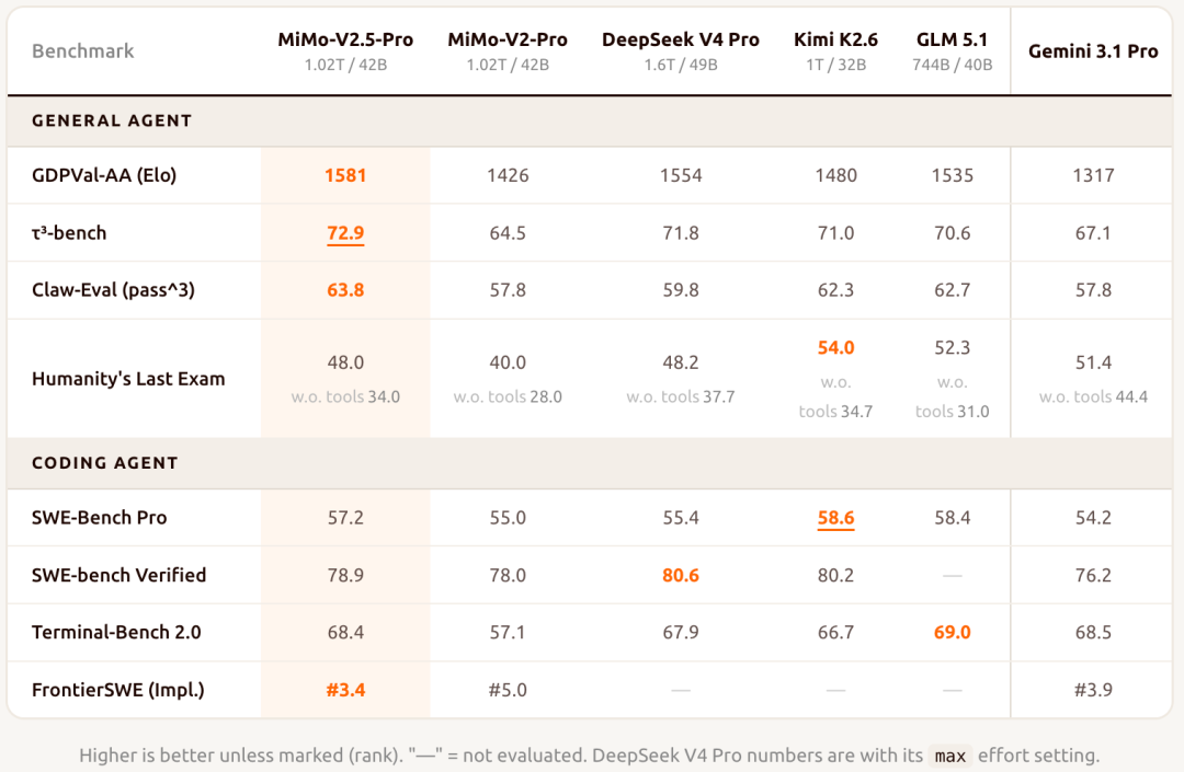 MiMo-V2.5-Pro的完整基准测试结果今日公布,小米称其在GDPVal-AA(Elo)、Claw-Eval(pass^3)等多项测评中超过了最新开源的DeepSeek-V4-Pro模型,也超过了发布不久的Kimi K2.6等主流闭源模型,实现总体最佳。