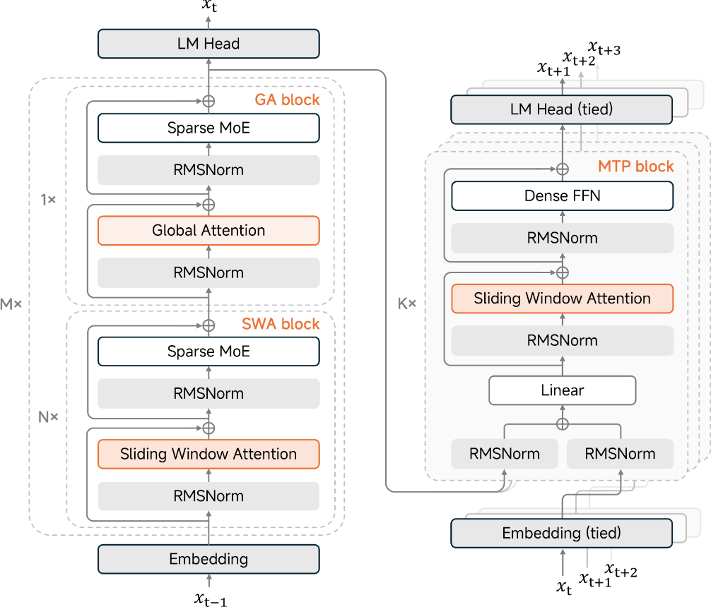 MiMo-V2.5-Pro继承了MiMo-V2-Flash的混合注意力机制和多标记预测(MTP)设计。局部滑动窗口注意力(SWA)和全局注意力(GA)以6:1的比例交错使用,窗口大小为128个Token,在长上下文情况下,通过可学习的注意力池偏置,将键值缓存存储空间减少了近7倍,同时保持了性能。一个轻量级的MTP模块,采用密集前馈神经网络(FFN),原生集成用于训练和推理,输出吞吐量大约提升了三倍,并加速了强化学习(RL)的部署。