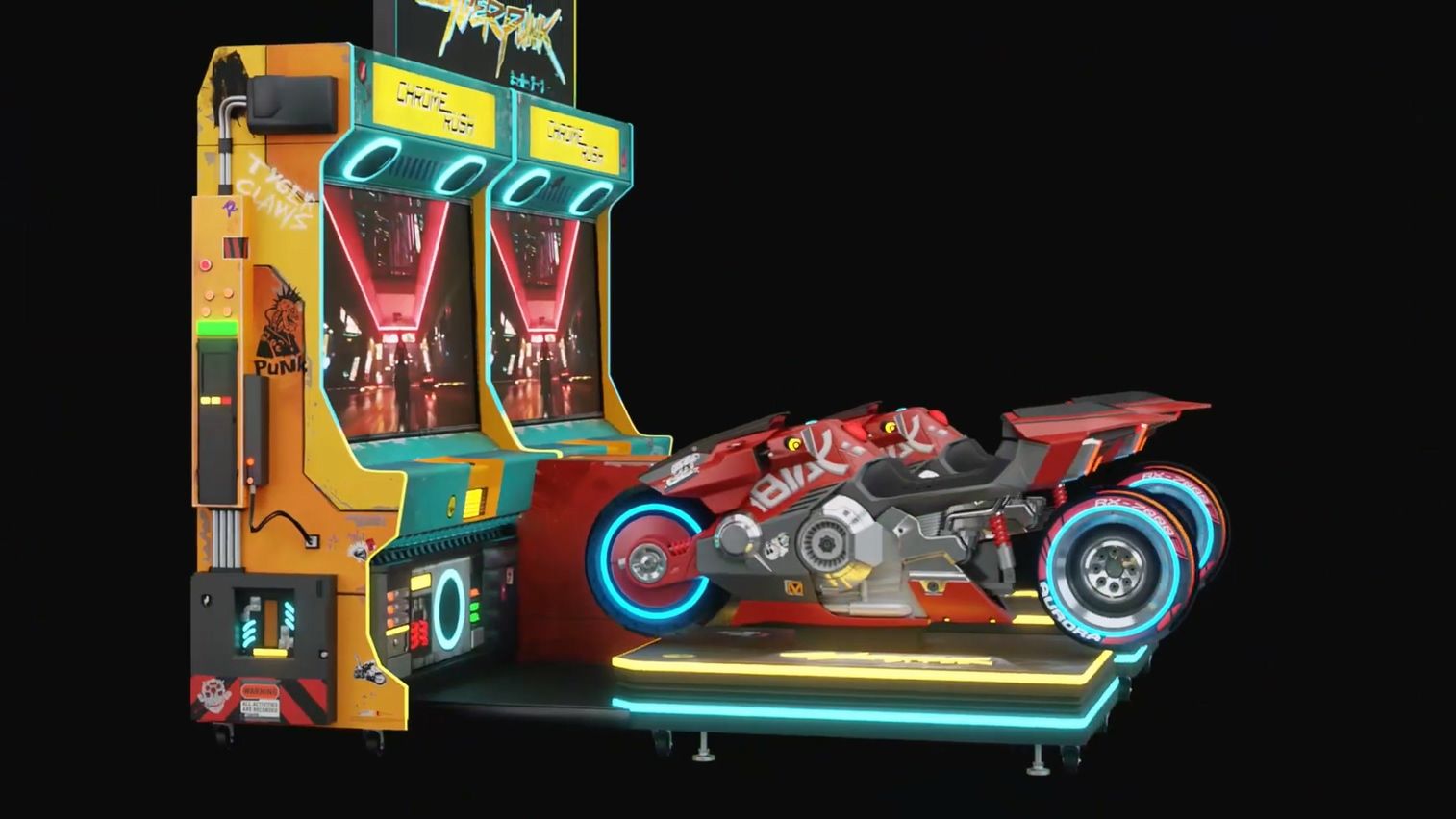 从官方发布的首支预告片看,该街机最引人注目的莫过于一套巨大的搭乘型控制器。这套外设完美模拟了游戏中高人气摩托车Yaiba Kusanagi的骑行姿态,让玩家能身临其境地压弯、加速,感受夜之城霓虹闪烁的街道。