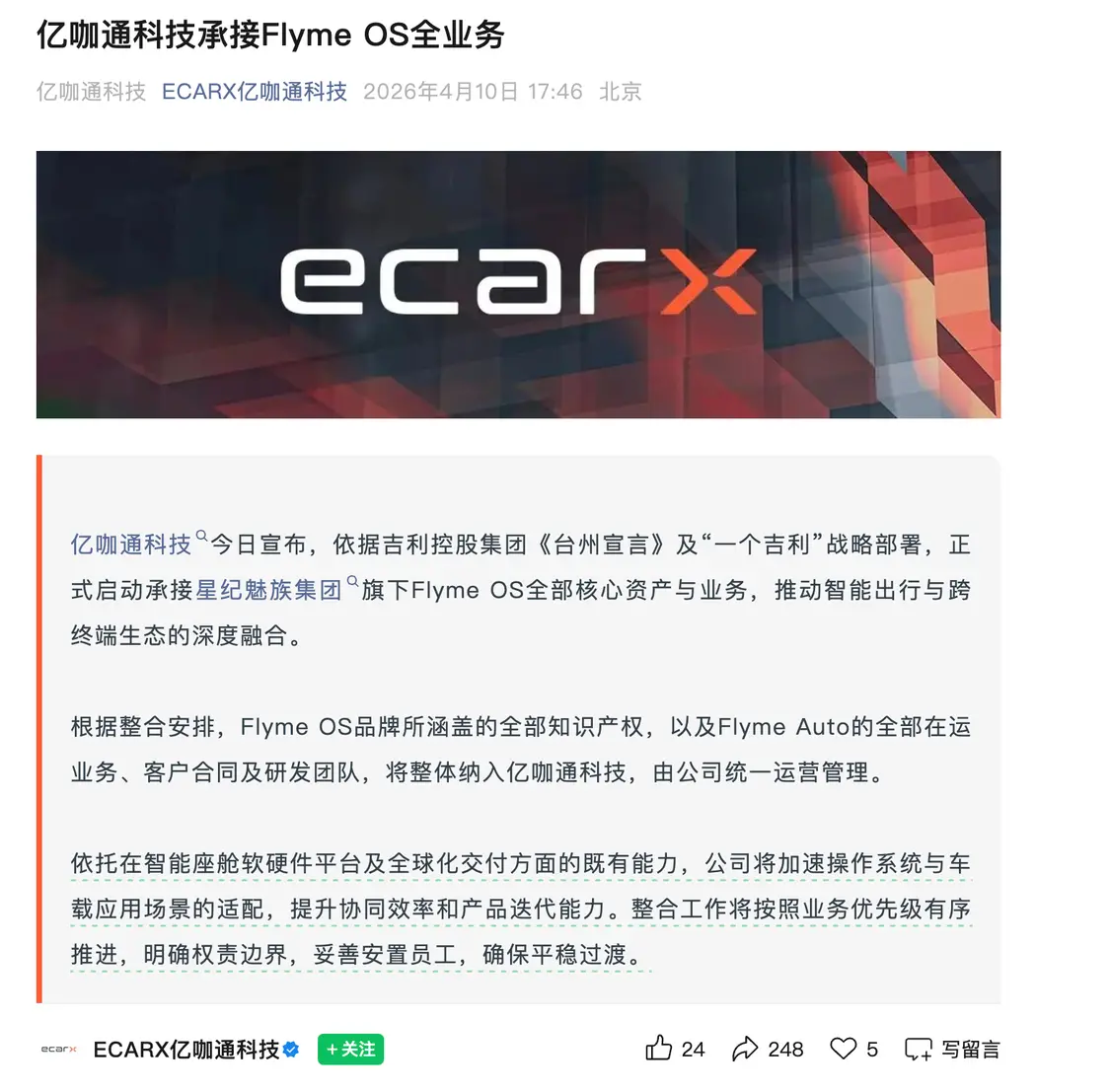 4月10日,亿咖通科技宣布,公司已正式启动承接星纪魅族集团旗下Flyme OS全部核心资产与业务。根据整合安排,Flyme OS品牌所涵盖的全部知识产权,以及Flyme Auto的全部在运业务、客户合同及研发团队,将整体纳入亿咖通科技,由该公司统一运营管理。