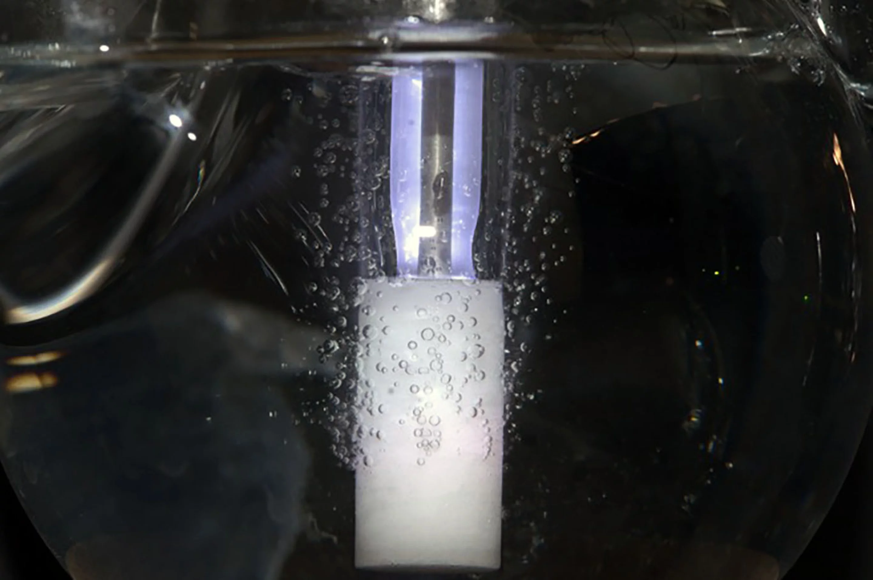 针对这两个关键挑战,西北大学团队提出了一套堪称“瓶中闪电”的新系统。 研究人员不再依赖极端的高温高压,而是在充满水的反应器中,通过短促而高能的电脉冲在玻璃管内产生等离子体——这是一种类似闪电的高能态物质形态。 在反应器内部,甲烷气体被通入一根多孔玻璃管,管壁表面负载铜氧化物催化剂;当高压电脉冲施加时,管内气体瞬间被转化为等离子体,使甲烷和水分子同时被打碎,形成高度活泼的碎片。