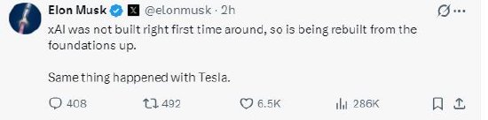 马斯克在社交平台X上回应网友对这一事件的评论时称:“xAI最初构建时并不完善,因此正从基础开始进行重新构建。特斯拉也经历了同样的情况。”