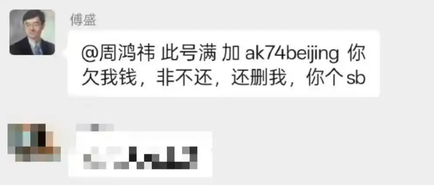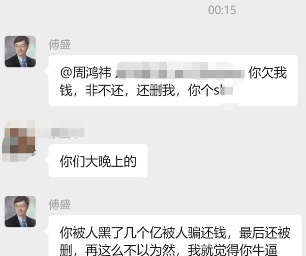 傅盛在群内还称,“你欠我钱,非不还,还删我,你个xx。”他还表示,“你被人黑了几个亿被人骗还钱,最后还被删,再这么不以为然,我就觉得你牛逼。”