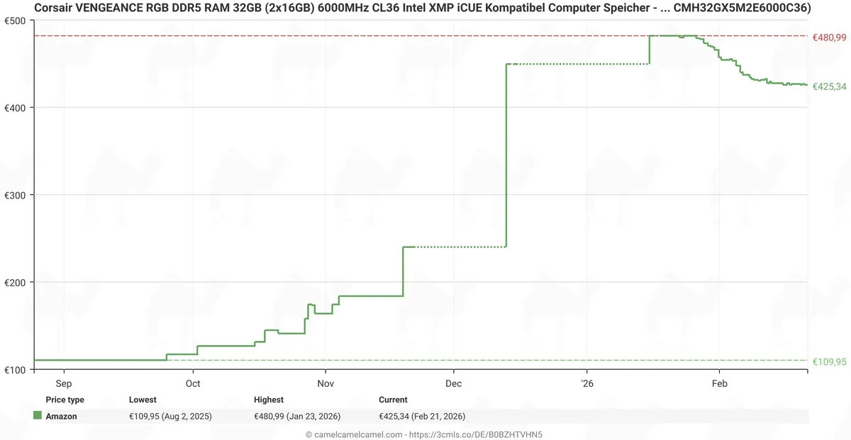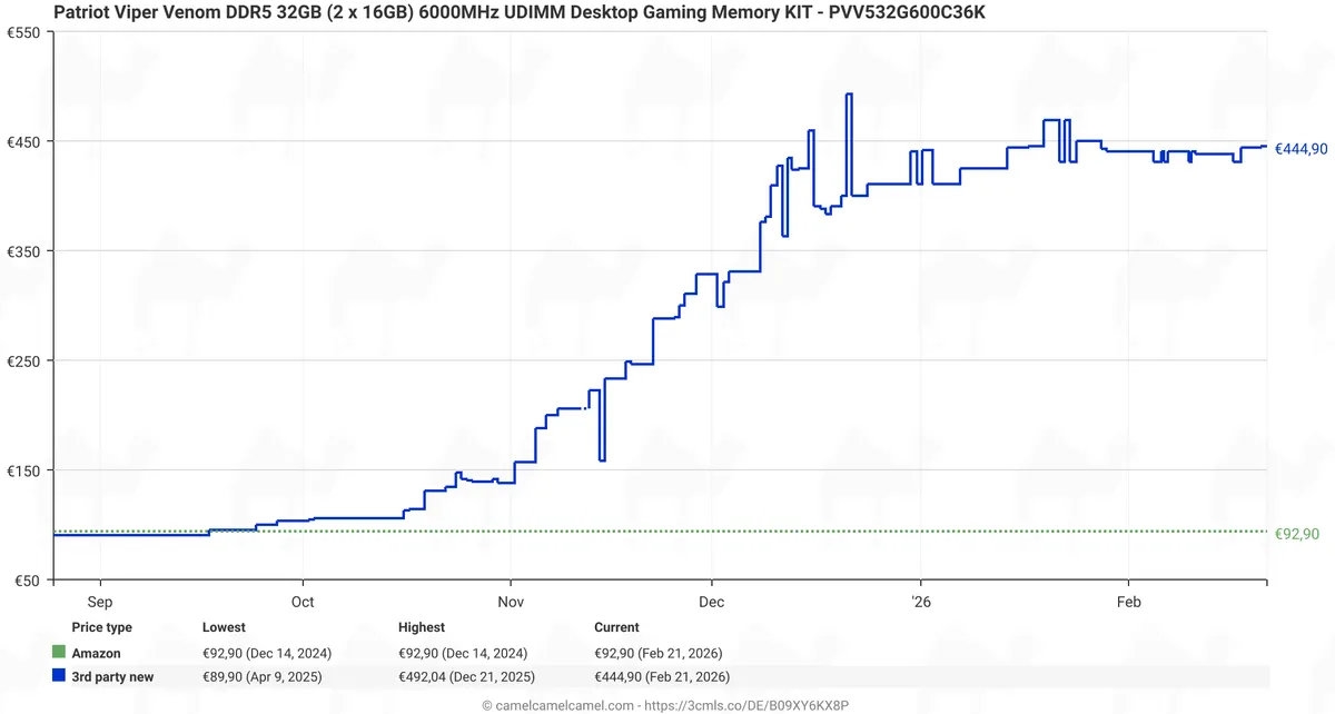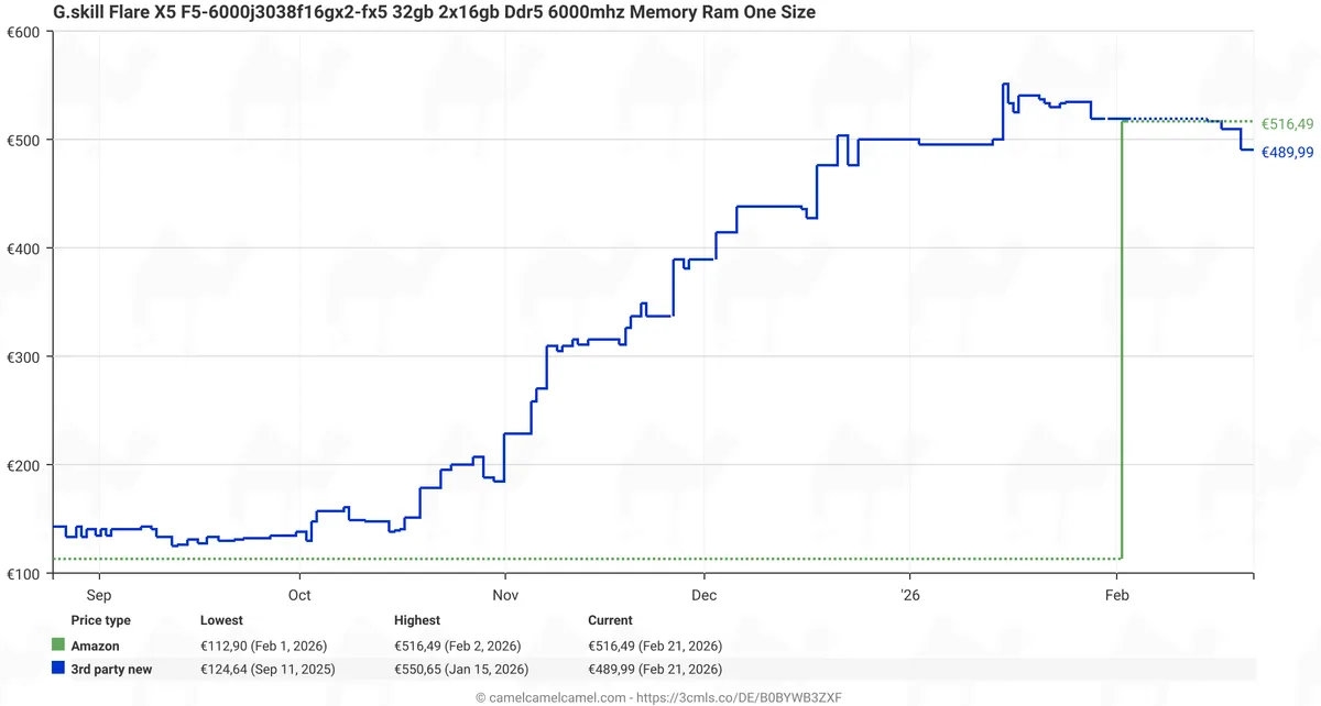 内存价格已经疯狂了小半年,预计还会持续很长一段时间,但是在欧洲,部分DDR5内存居然开始降价了。有网友一直在追踪32GB DDR5内存套装在欧洲的价格,给出了一条奇怪的曲线。