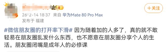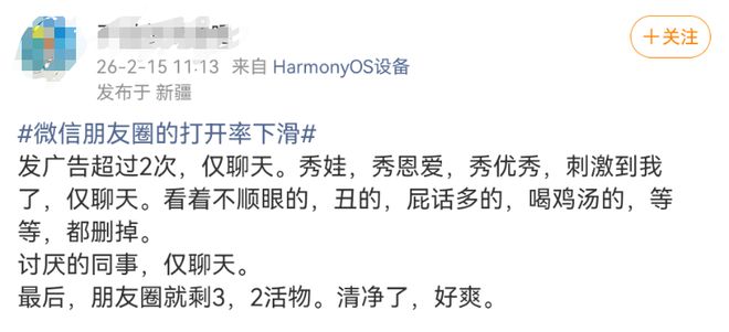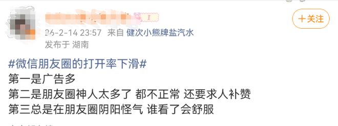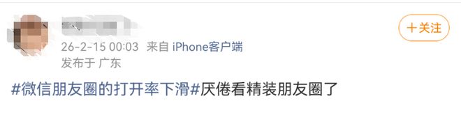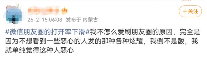 2月15日,话题“微信朋友圈的打开率下滑”还登上热搜,引发热议。上述“QuestMobile 2025年数据”显示,朋友圈日均内容发布量较2021年峰值下降37%,近半用户全年发帖量不足2023年的15%,部分用户从“日更”沦为“数月一更”甚至停更。