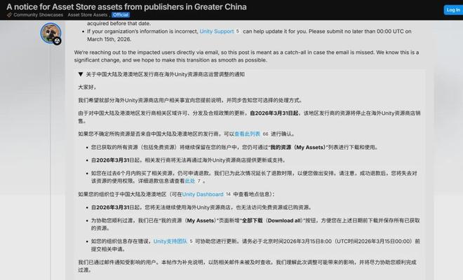 “OpenAI不Open,团结引擎不团结。”今日,全球知名游戏引擎Unity正式发布通知,称因区域许可、分发及合规政策更新,将终止向中国地区(含中国香港、中国澳门特别行政区)的组织提供海外Unity资源商店访问权限,该调整将于2026年3月31日正式生效。