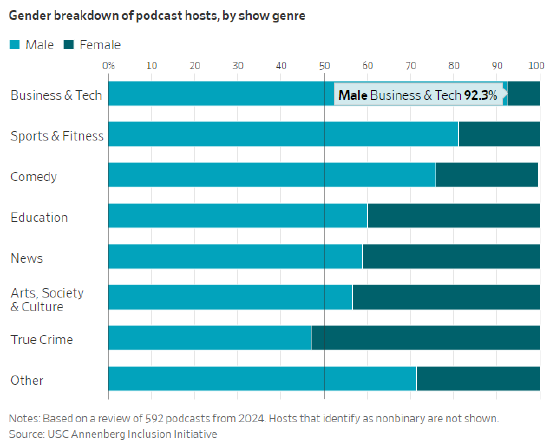 南加州大学安纳伯格新闻传播学院针对 592 档节目的调研显示,约三分之二的播客主播为男性,这一比例在喜剧、商业与科技类播客中更高。