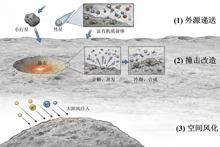 早期太阳系中,小行星和彗星像快递员一样,持续向地球等类地行星输送有机质以及碳、氮、氧、磷、硫等与生命相关的元素。地球地质活动活跃,相关早期记录大多被破坏。相比之下,月球地质活动较弱,如同一枚时间胶囊,保存了地外有机质输入及后续演化信息。