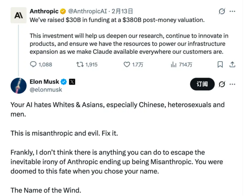 就连Anthropic官号宣布融资300亿美元的好消息,马斯克都在下面追着骂。