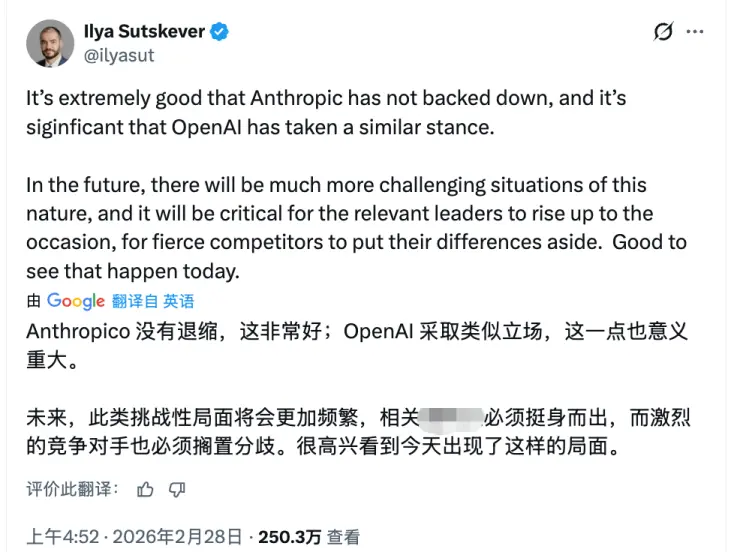 OpenAI的联合创始人及前首席科学家、大名鼎鼎的伊利亚·苏茨克维(Ilya Sutskever),一反沉默常态,公开为Anthropic“没有退缩”拍手叫好,还破天荒地提了一嘴OpenAI。