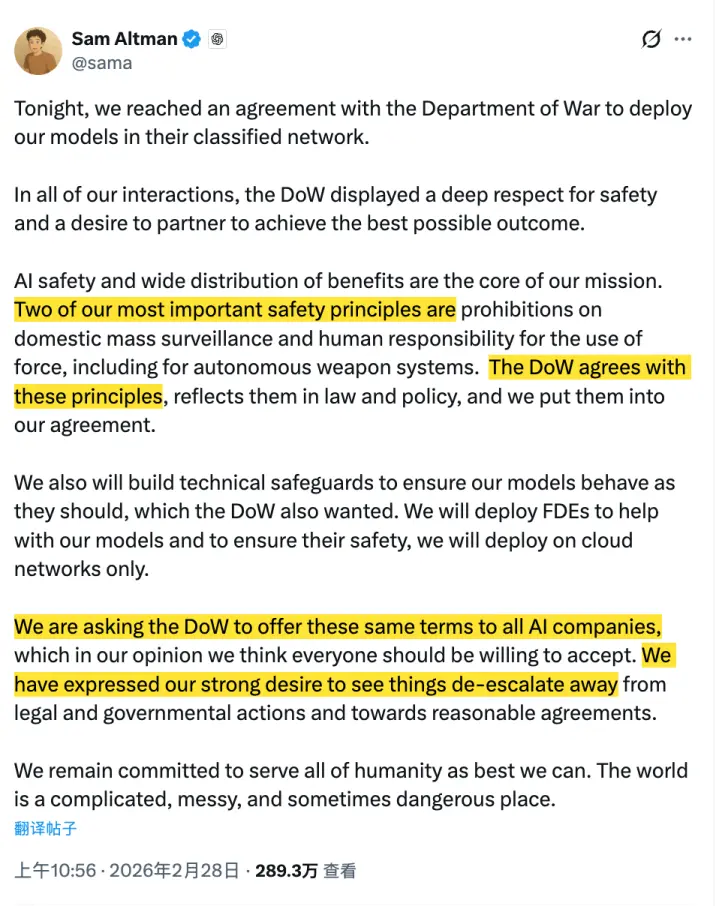 奥特曼突然在X上宣布:OpenAI和DoW,也达成合作了。