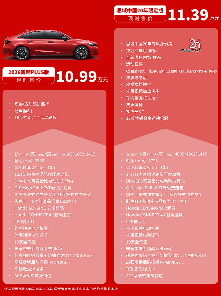 如果说燃油车时代哪款车最受年轻消费者的喜爱,那一定非本田思域莫属,虽然受中国新能源冲击销量严重下滑,但迄今仍有不少忠实粉丝。近日,新款本田思域上市,共推出四款配置车型,限时售价9.79万元起,即便是顶配也不到13万,相较于巅峰时期可谓是大幅降价,其中售价11.39万的20年限定版为新增车型,拥有专属设计。