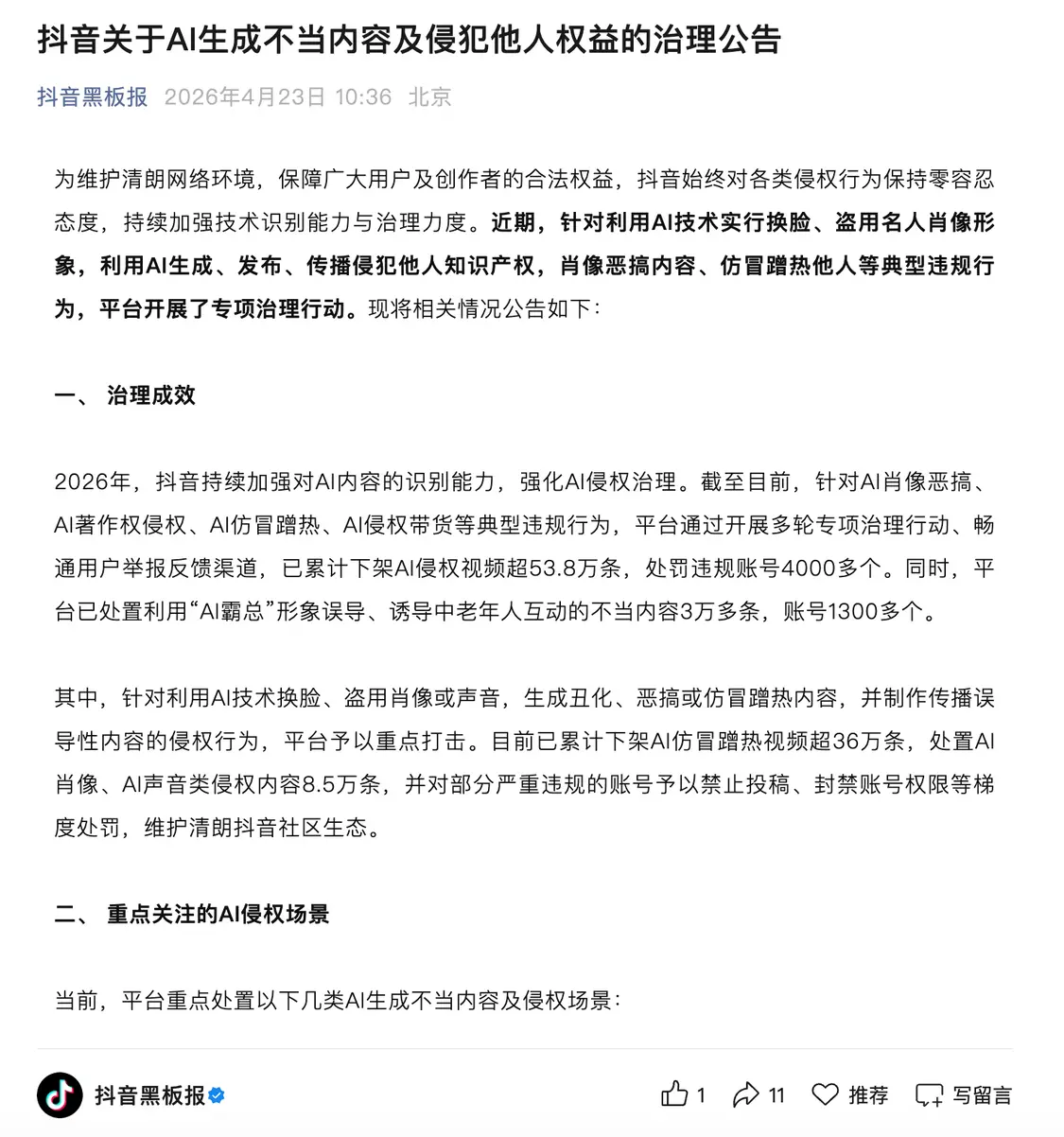 4月23日,抖音官方发布公告:近期,针对利用AI技术实行换脸、盗用名人肖像形象,利用AI生成、发布、传播侵犯他人知识产权,肖像恶搞内容、仿冒蹭热他人等典型违规行为,平台开展了专项治理行动。