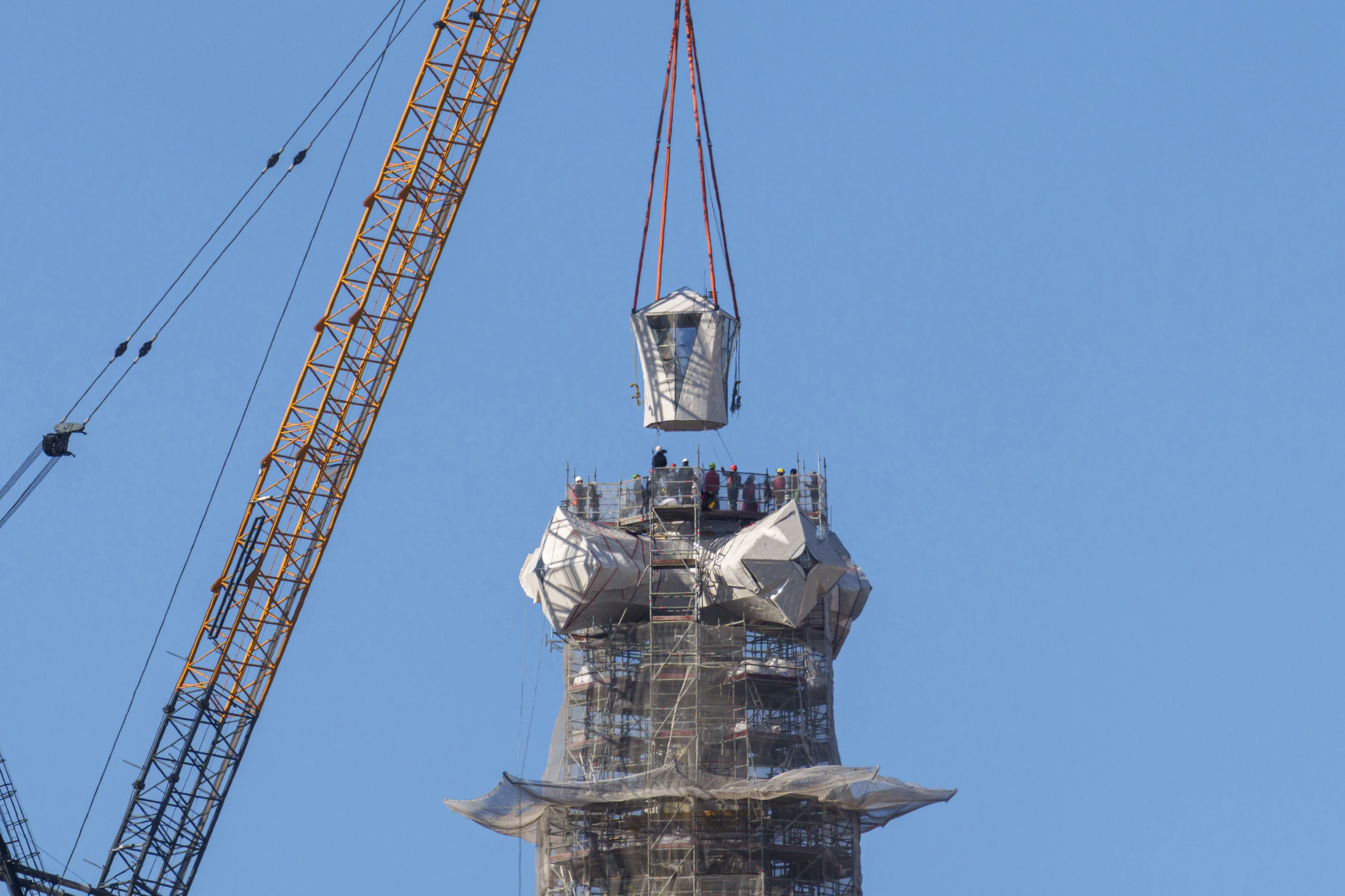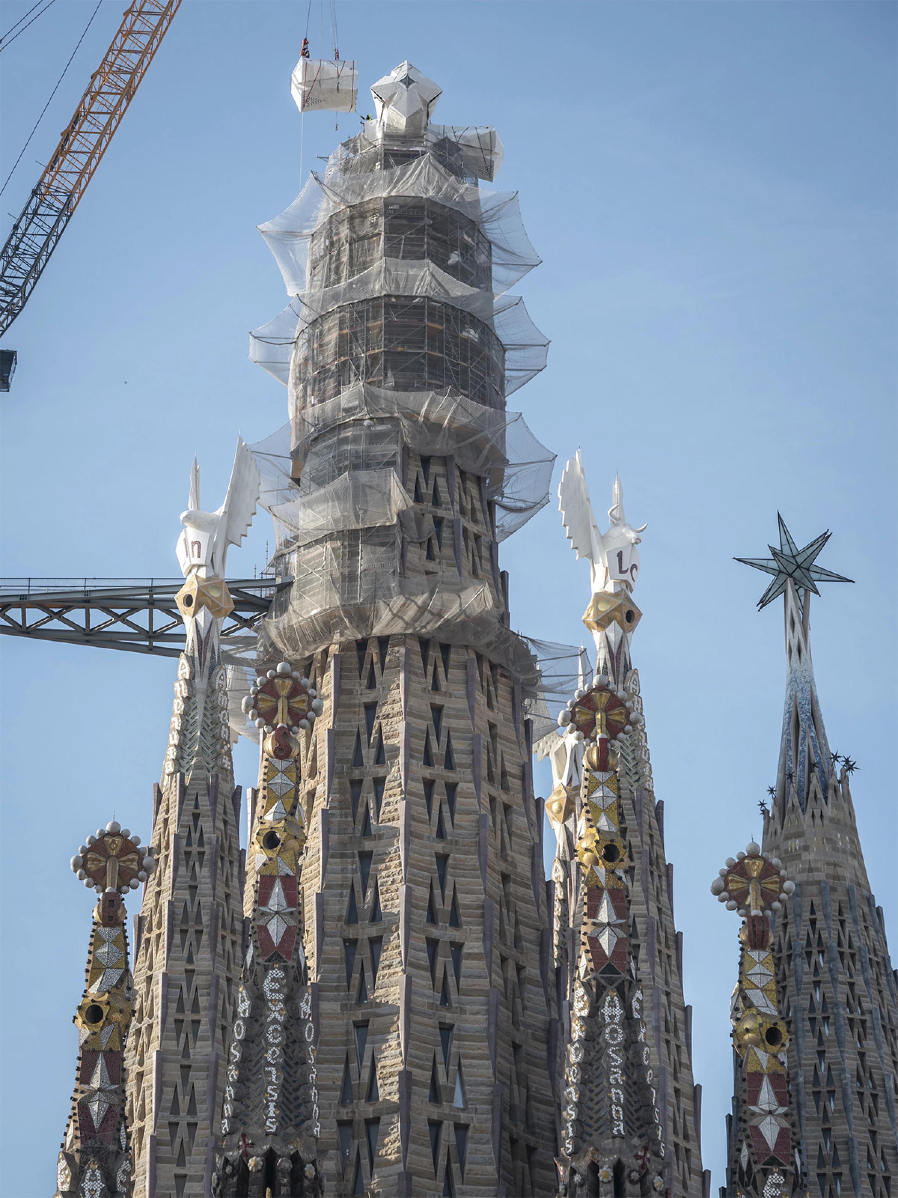 文章作者指出,圣家堂最高的耶稣塔已达到最终高度,其顶部安装了一座三维四臂十字架的上臂结构,该构件采用玻璃与白色搪瓷陶瓷包覆,象征性地为教堂的六座中央塔群画上句号,使整座大教堂总高度达到约172.5米(566英尺)。这座十字架本体高度约17米,上臂部件本身接近4.5米高,借助巨型起重机完成吊装。
