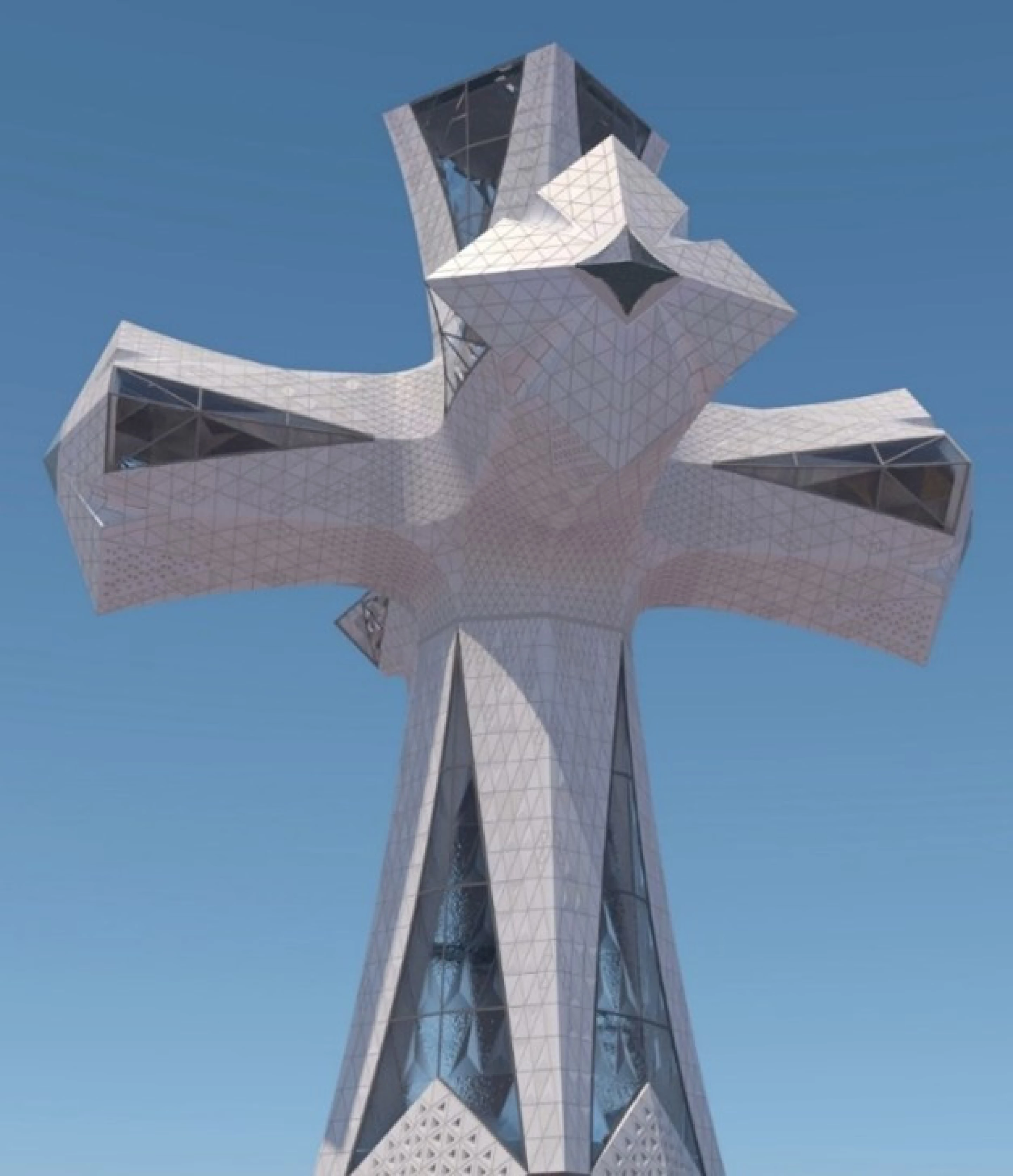 尽管外立面现已“技术性完工”,文章指出,未来约八年内仍将持续开展内部与细部的收尾工程,包括十字架臂部的进一步包覆处理、内外装饰构件以及雕塑创作等。其中最受关注的作品之一,是象征“天主的羔羊”的“Agnus Dei”雕塑,由意大利艺术家安德烈亚·马斯特罗维托在去年通过竞赛中标设计。该方案将一尊由中空玻璃制成并覆以玻璃碎片的羔羊形象悬挂在十字架上臂之下,整体置于覆以金箔的双曲面结构之中,寓意物质与能量、圣子与圣父之间的关系。