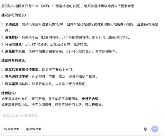 面对同样的问题,DeepSeek给出了两种答案,建议步行的理由是“节约资源、避免排队、走路环保、避免挪车麻烦”,而建议开车的理由是“洗车后可以直接用车,开车排队人在车上更方便”。