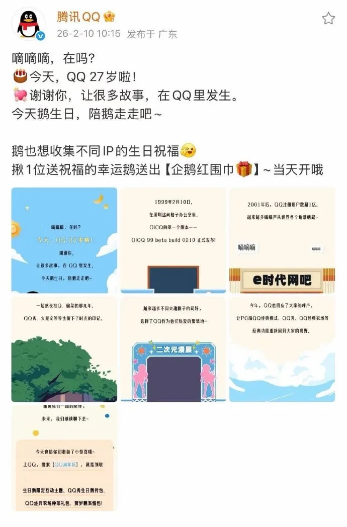 2月10日,腾讯QQ迎来其诞生后的第27个年头。腾讯公司公关总监张军也发文庆祝QQ上线27周年纪念日,并祝福QQ生日快乐。张军表示,“27年前,一串滴滴声中,稀里糊涂地开始了上网的征程。一路趟过拨号上网,宽带,3G,4G乃至5G,暮然回首,轻舞飞扬已经不见,QQ还在。”