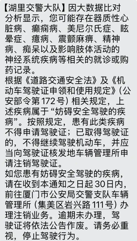 近日,网友发布的一条通知注销驾驶证的短信备受关注。短信内容显示:(湖里交警大队)因大数据比对分析显示,您可能存在器质性心脏病、癫痫病、美尼尔氏症、眩晕症、癔病、震颤麻痹、精神病、痴呆以及影响肢体活动的神经系统疾病等相关的就诊或购药记录。