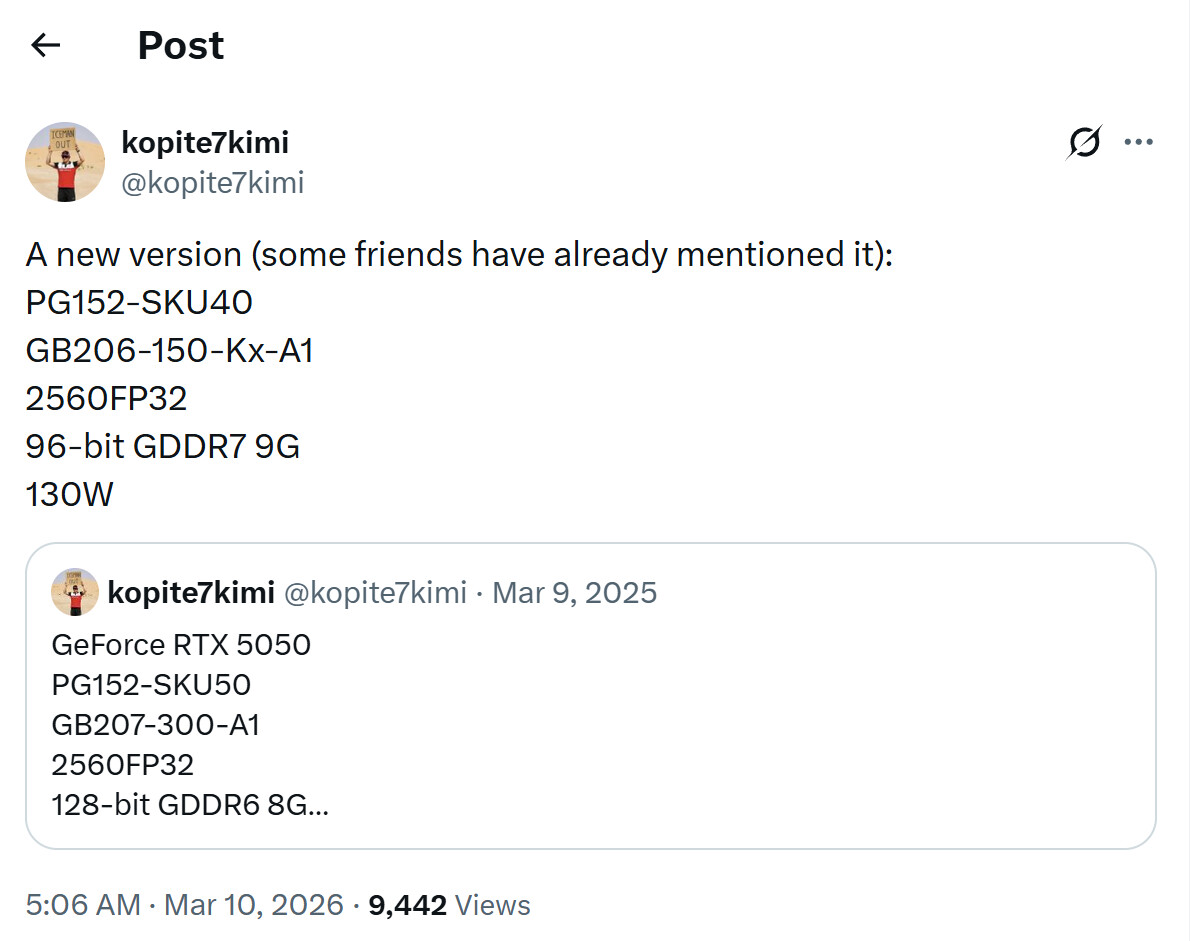 随着台北国际电脑展(Computex 2026)的临近,业界普遍预期这款 9 GB GDDR7 版本的 GeForce RTX 5050 将会在展会期间左右正式亮相,为英伟达 RTX 50 系列在主流入门价位段再添一款新成员。目前英伟达尚未就该卡的上市时间和具体定价给出官方信息,但从爆料来看,在保持 130 W 功耗不变的前提下,通过升级显存规格来提升带宽和容量,成为这款新版本的主要卖点。