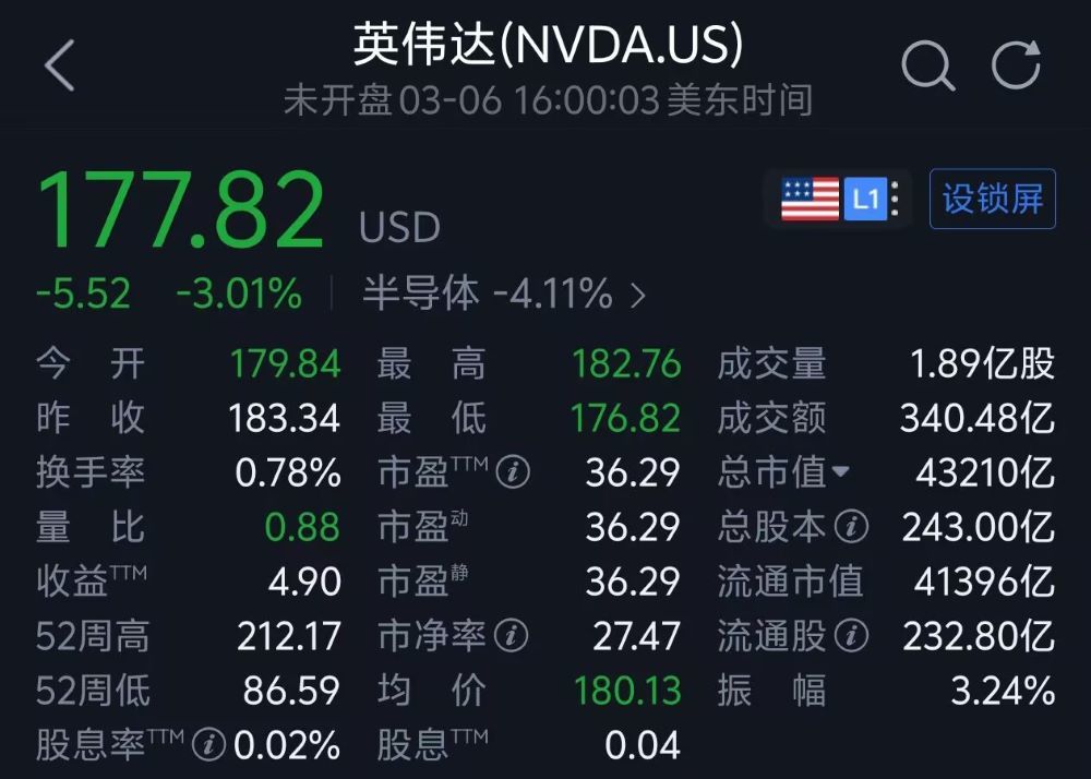 3月7日,当甲骨文、OpenAI决定取消扩建的消息传出之后,英伟达股价回吐早盘涨幅,截至当日纽交所收盘时,其股价下跌3.01%,收盘价为177.82美元。