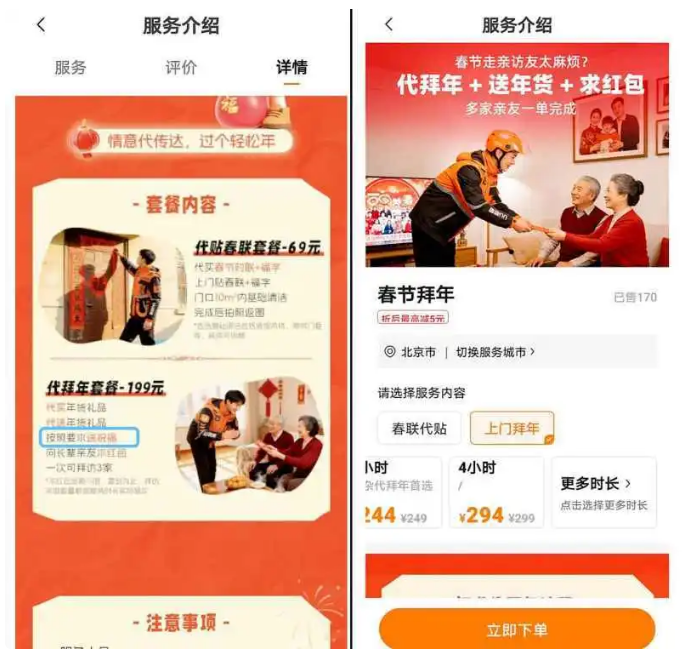 目前平台保留的服务主要包括“春联代贴”及“上门拜年”等。“上门拜年”提供从2小时到10小时不等的时长选择,价格在194元至594元之间;另有“代拜年”套餐标价199元,涵盖代买年货、代送礼包及代送祝福等内容。