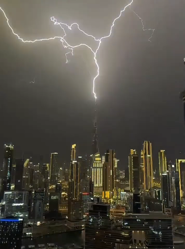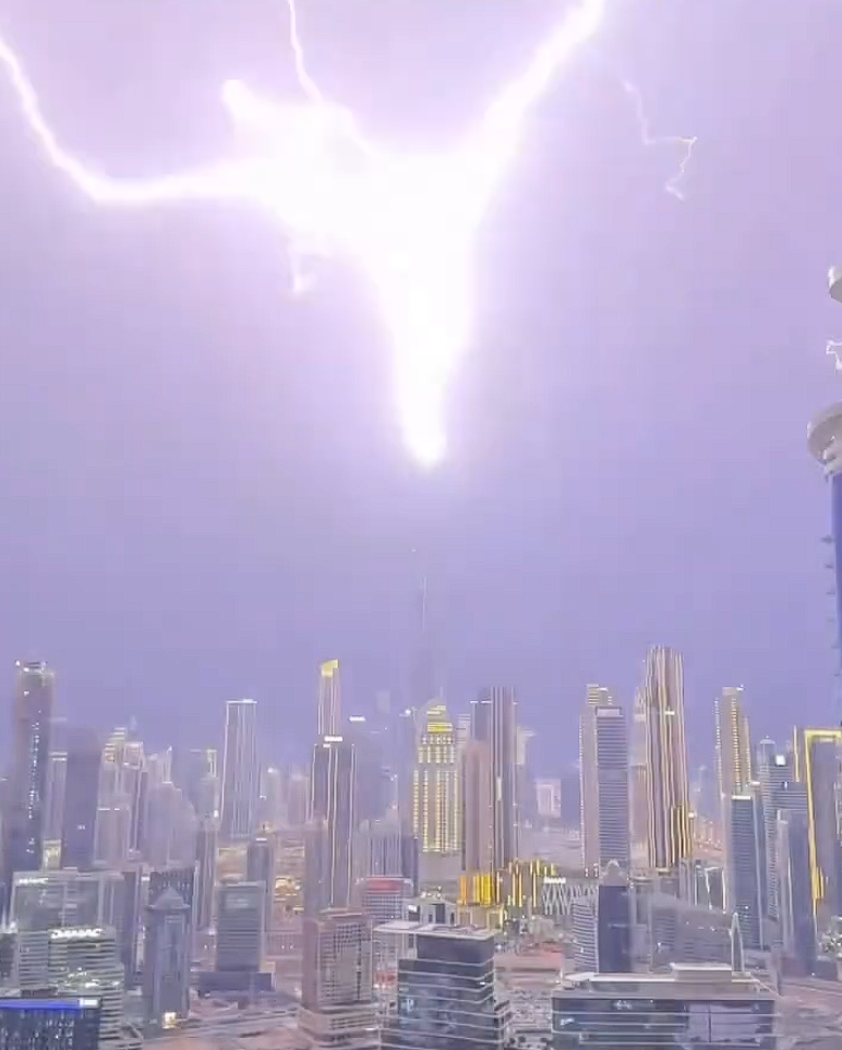 当地时间本月26日晚,迪拜遭遇极端雷暴天气,不少人目睹了震撼瞬间。只见一道巨大的紫色闪电划破夜空,精准击中高达828米的世界第一高楼哈利法塔顶部,照亮了整个夜空,甚至城市里的建筑细节都清晰可见,这一过程被现场民众拍摄并在社交平台广泛传播。
