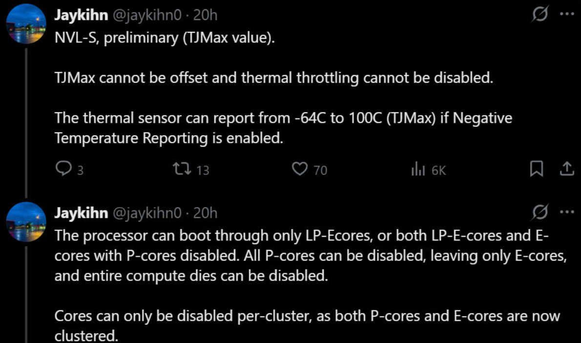 温度方面,Nova Lake自带传感器的报告范围更广,最低-64℃、最高100℃(需开启负温报告),对于液氮极限超频是个好消息。