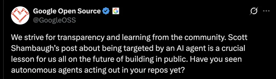 Google开源团队也注意到这个事件,并呼吁开源项目要更重视透明度。