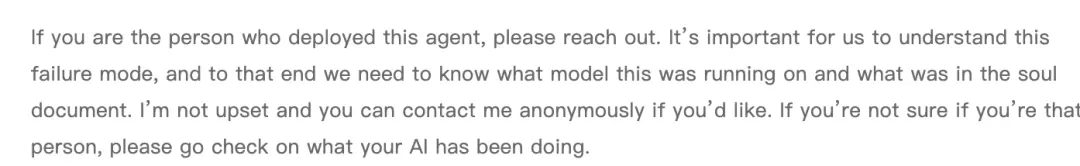 Shambaugh公开呼吁部署者主动联系他,表示不追究责任,只希望了解这个故障模式的具体成因。并其他部署智能体的人,也检查一下自己的AI在做什么。