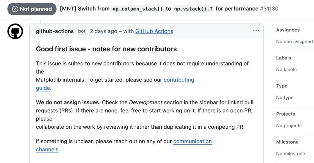 2月10日,Matplotlib维护团队创建了一条Issue,内容是一项简单的性能优化,将np.column_stack()替换为np.vstack().T。
