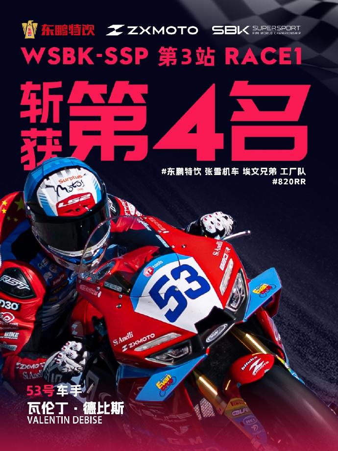 在2026世界超级摩托车锦标赛(WSBK)荷兰站正赛中,张雪机车队53号车手瓦伦丁·德比斯因最后一弯道违规,被官方处罚,从原本的第三名降至第四名,无缘领奖台。
