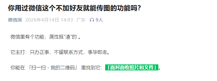 今日,“微信派”公众号发文科普了微信中的“面对面收照片和文件”功能。官方表示,这个功能属性挺“渣”的,主打只办正事,不留联系方式,事毕即走。