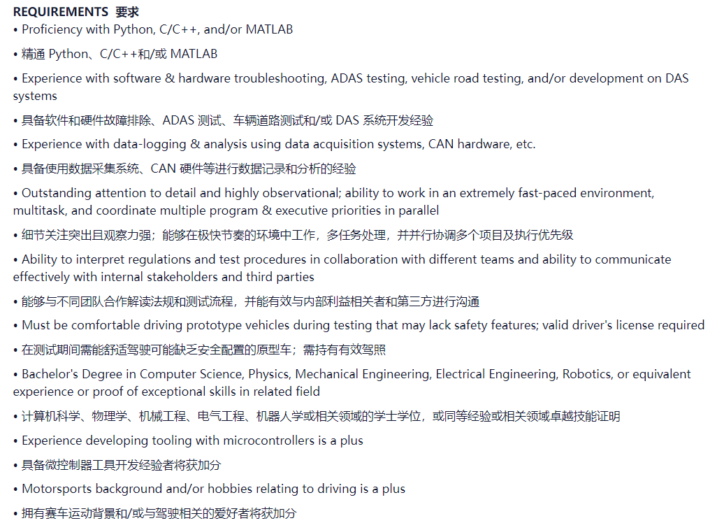 除了兼具软硬件能力、具备数据记录和分析经验这些常规的技术性要求以外,岗位还提示会驾驶可能缺乏安全配置的原型车,有赛车运动背景、具备驾驶相关的爱好是加分项。