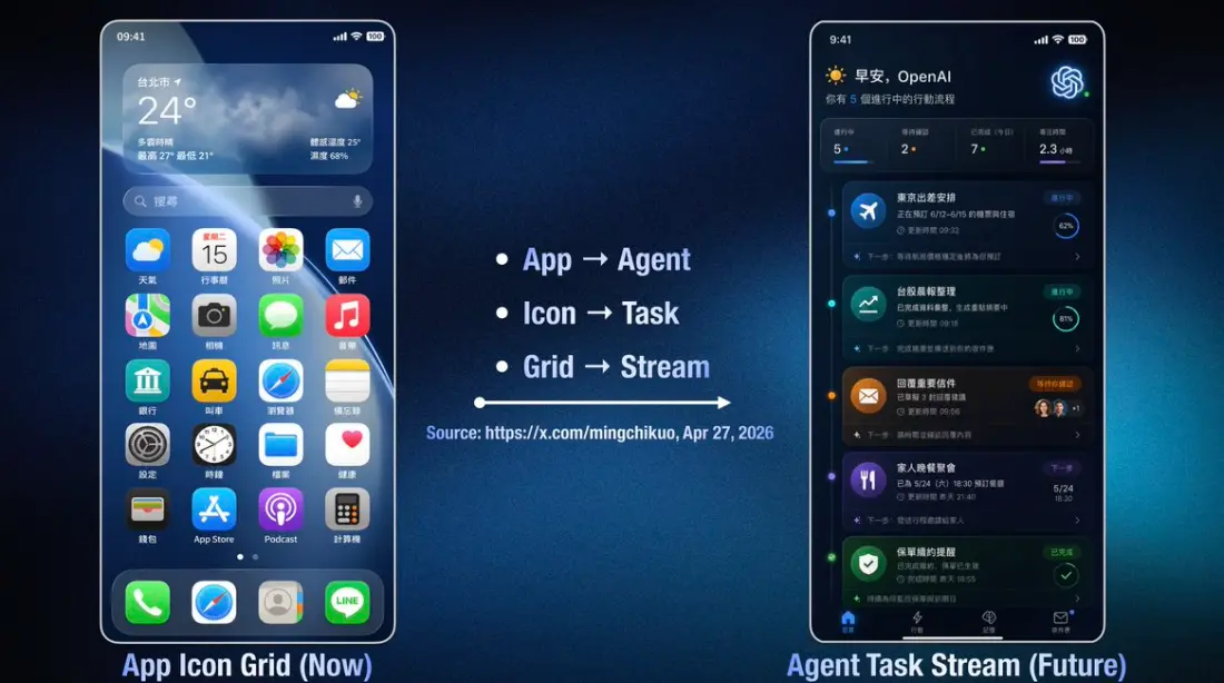 郭明錤称,AI智能体重新定义手机,用户的目的不再是使用一堆应用程序,而是通过手机执行任务并满足各种需求。这从根本上改变了对手机的认知。 郭明錤还给出了手机界面概念设计图,并与当前手机(以iPhone为例)进行对比。