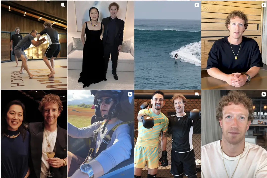 现在的扎克伯格,仿佛换了一个人。他留起了卷发,脖子上挂着金链子,在 Instagram 近一半的内容都是格斗训练、被汗水浸透的肌肉、WWE 现场的 VIP 观战席。