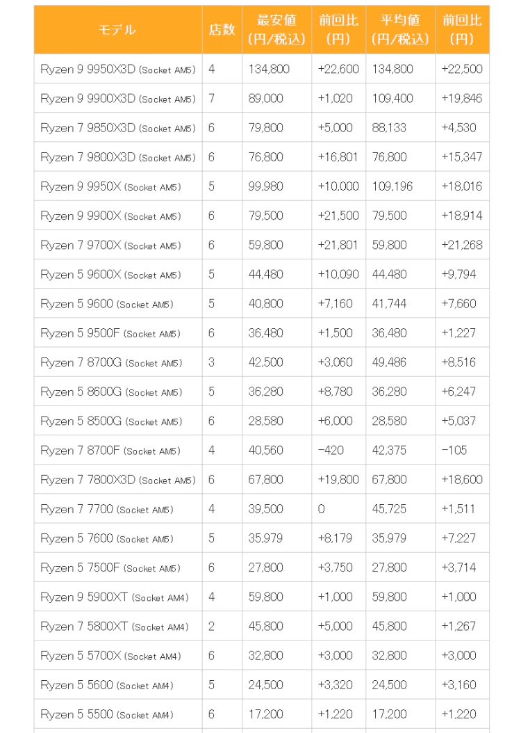 锐龙9 9900X涨37.1%至79500日元,锐龙5 9600X涨22.6%至44,480日元,定位高端的X3D型号也未能幸免,9800X3D涨21.8%至76800日元,9950X3D涨20.1%至134800日元。