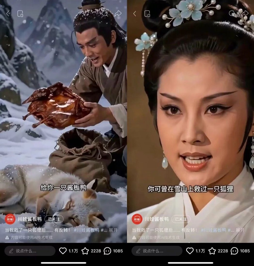 “你可曾在雪山救过一只狐狸?”“我不是狐狸,我是那只酱板鸭!”近段时间,这两句魔性台词伴随着邵氏武侠画风的AI短视频席卷全网,掀起一场全民参与的创作狂欢。