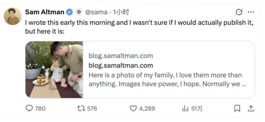 惊魂未定的奥特曼随后罕见晒出全家福,写了一篇长文。他说AGI已经成了魔戒,真正危险的不是技术,是“要成为控制AGI的那个人”这种念头,能让人做出极其疯狂的事。他还第一次公开为2023年的董事会风波道歉,承认自己“害怕冲突”的性格给公司造成了巨大的烂摊子。