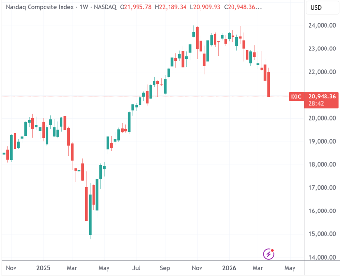 随着2月28日点燃的中东战火持续燃烧了一整个月,美股市场也出现了加速下跌的迹象,特别是曾经光芒万丈的科技巨头。截至周五收盘,纳斯达克指数本周累计下跌3.23%,创去年4月“关税冲击”以来最大单周跌幅。