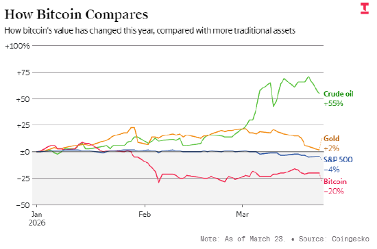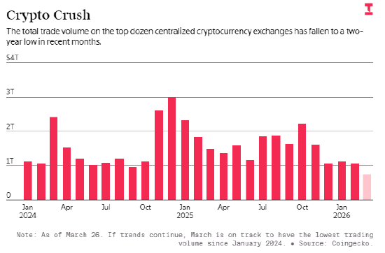 加密货币市场的持续下跌即将迈入第六个月,且仍看不到尽头,迫使企业裁员、转向股票交易与预测市场等业务。比特币自去年 10 月初触及 126080 美元高点以来已腰斩,其他加密资产跌幅更大。CoinGecko 数据显示,加密货币月度交易量或将创 2024 年 1 月以来新低,仅为总统大选后峰值的不到三分之一。加密咨询公司 Architect Partners 数据显示,一季度加密初创企业融资额约 29 亿美元,环比暴跌 69%。