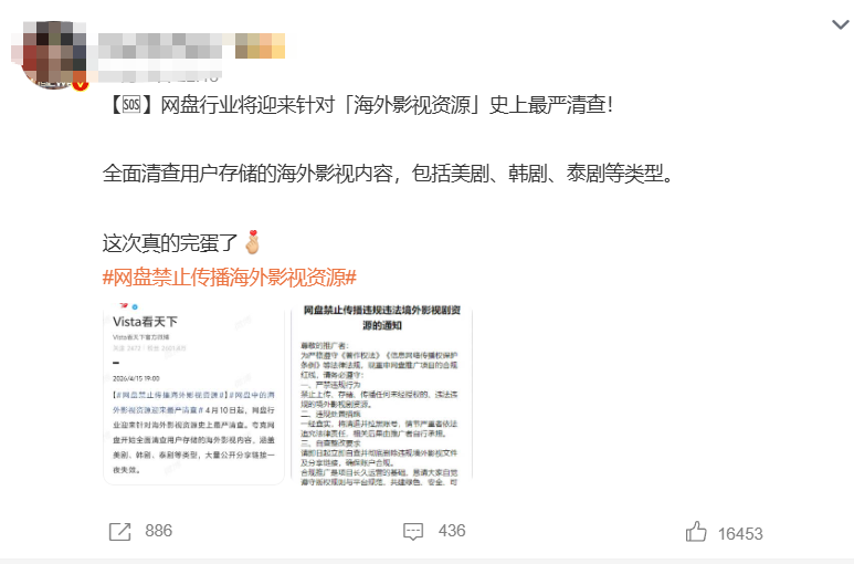今日,#网盘禁止传播海外影视资源#话题登上微博热搜,引发众多网友热议。消息发酵后,无数追剧用户直呼“天塌了”。据报道,4月10日起,网盘行业迎来针对海外影视资源史上最严清查。夸克网盘开始全面清查用户存储的海外影视内容,涵盖美剧、韩剧、泰剧等类型,大量公开分享链接一夜失效。