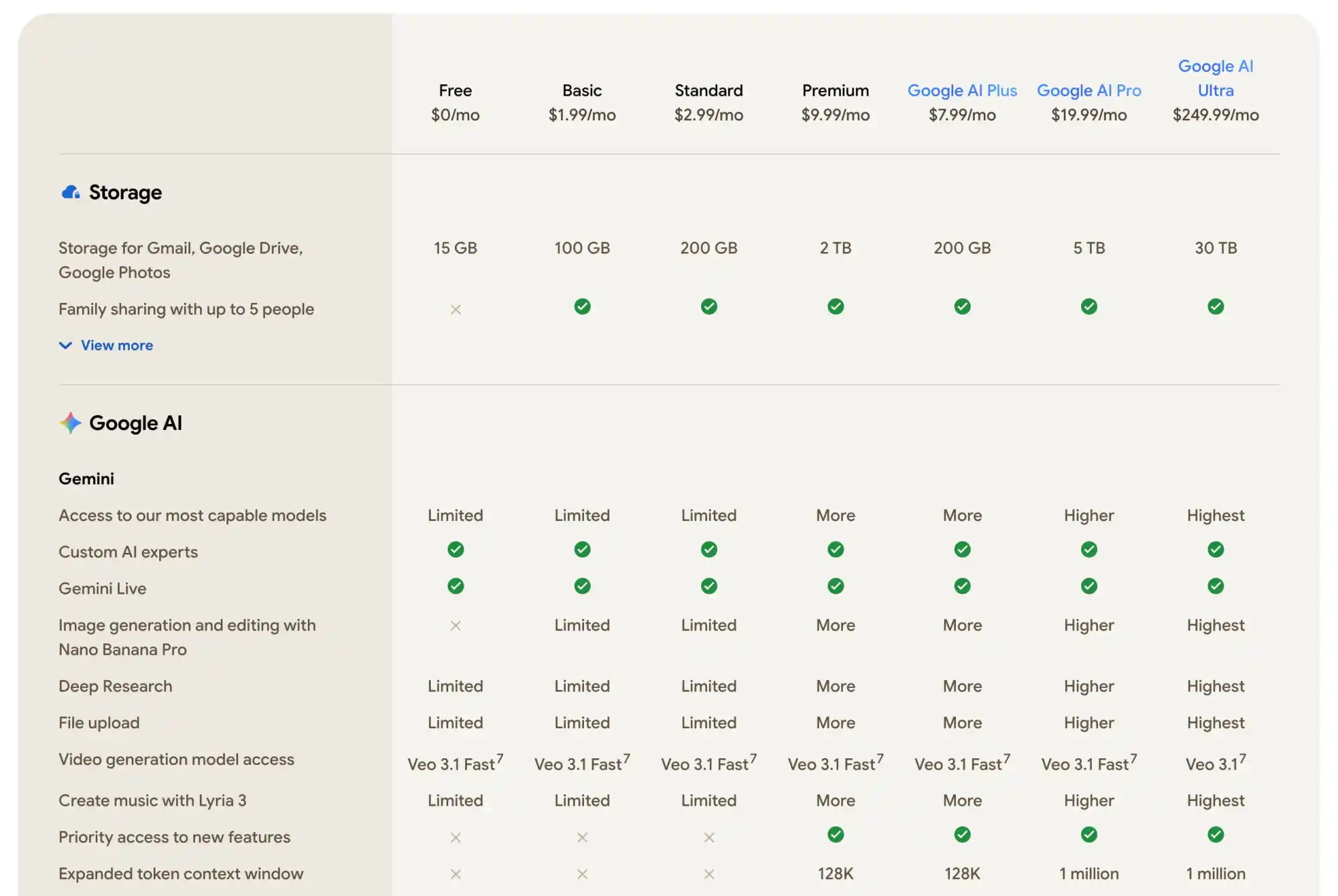 在 Google AI 套餐体系中,AI Pro 之上的下一档为 10TB 存储,月费 49.99 美元;20TB 为 99.99 美元/月,30TB 为 149.99 美元/月。此外,定位更高端的 Google AI Ultra 订阅同样提供 30TB 存储空间,月费为 249.99 美元。相比之下,价格更亲民的 7.99 美元 AI Plus 套餐仅包含 200GB 存储。