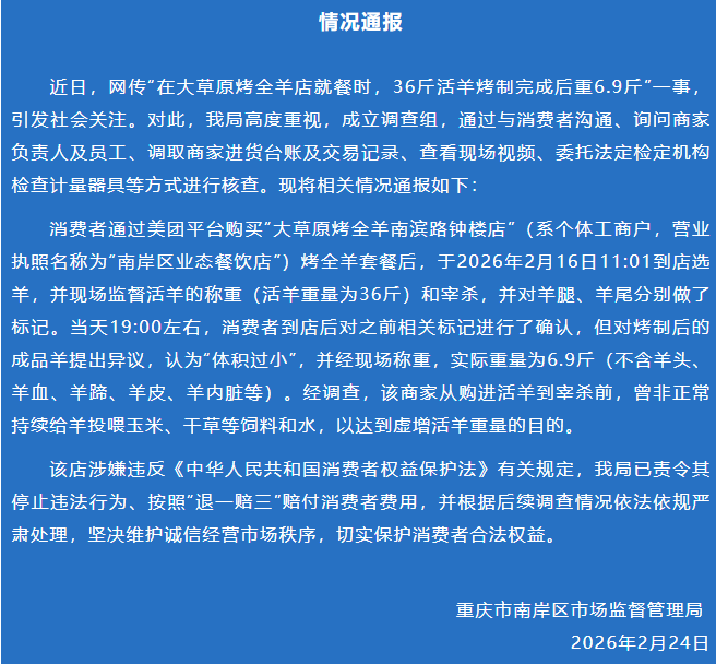 近日,网传“在大草原烤全羊店就餐时,36斤活羊烤制完成后重6.9斤”一事,引发社会关注。对此,我局高度重视,成立调查组,通过与消费者沟通、询问商家负责人及员工、调取商家进货台账及交易记录、查看现场视频、委托法定检定机构检查计量器具等方式进行核查。现将相关情况通报如下: