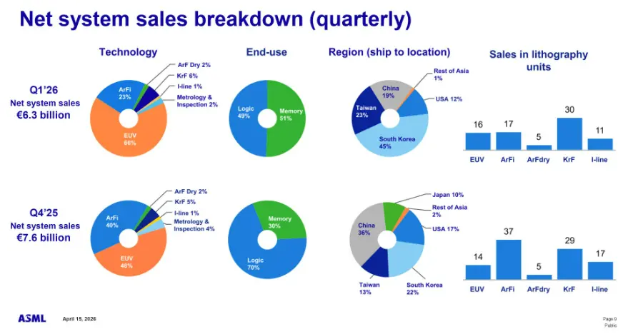 该公司公布了2026年第一季度按系统划分的销售额,其中51%的市场份额来自存储器相关终端应用系统,其余49%的销售额来自逻辑设计。EUV光刻技术仍保持领先地位,收入份额达66%,而DUV光刻机(ArF浸没式)的收入份额为23%。