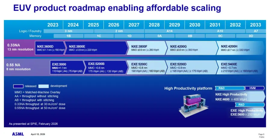 ASML表示,在技术方面,我们持续取得显著进展,并在今年二月于圣何塞举行的SPIE先进光刻和图案化会议上重点展示了多项最新成果。会上,我们发布了更新后的低数值孔径EUV产品路线图,其中体现了我们对这些产品短期和长期计划的改进。这包括在下一个十年之初实现低数值孔径EUV每小时至少330片晶圆的加工能力,这主要得益于我们持续改进光源功率,正如我们近期演示的1000瓦光源所证明的那样。