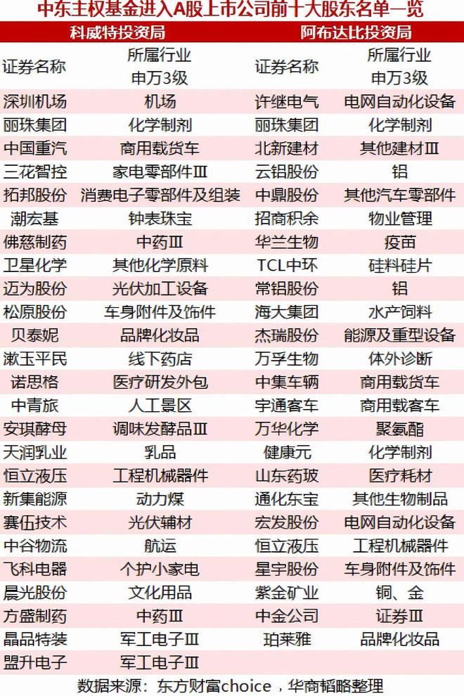 当然,比起找公司签合同认购股份,更省事的投法是直接在二级市场买。目前,A股上市公司中,前十大股东名单中有科威特投资局或者阿布达比投资局的上市公司就有49家,其中科威特投资局的有25家,阿布达比投资局的有24家。