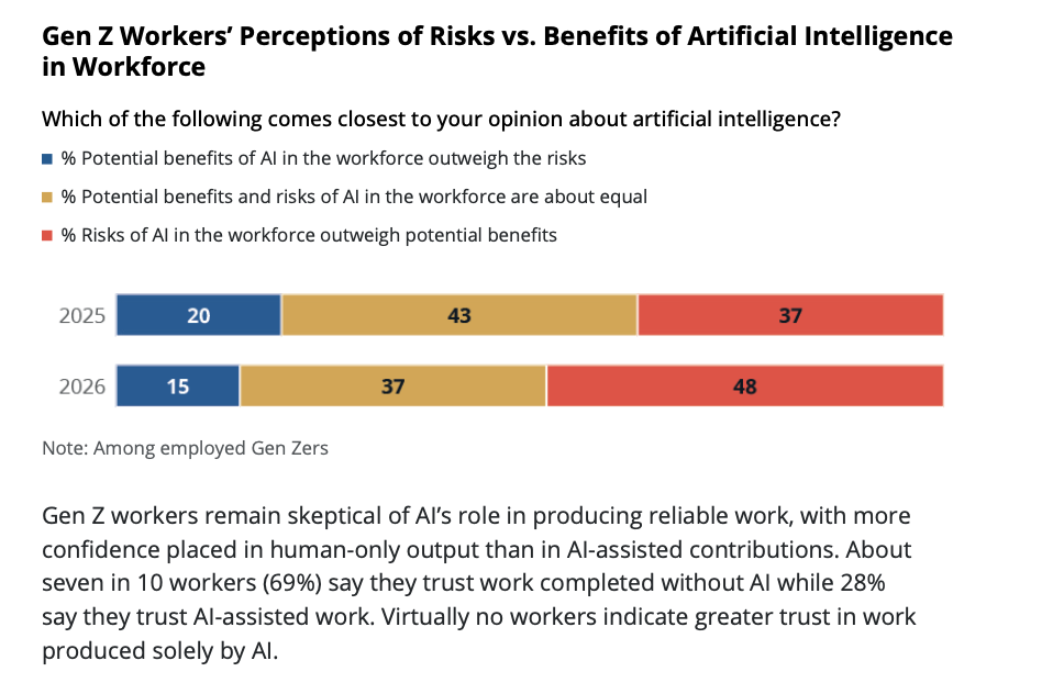 盖洛普数据显示,在已就业的Z世代中,高达48%的人认为AI在工作场所的风险远大于收益,这一比例在一年内激增了11个百分点。认为收益大于风险的仅占15%。