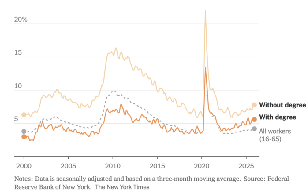 纽约联邦储备银行的数据显示,去年底,22至27岁大学毕业生的失业率飙升至5.6%,远超整体失业率。